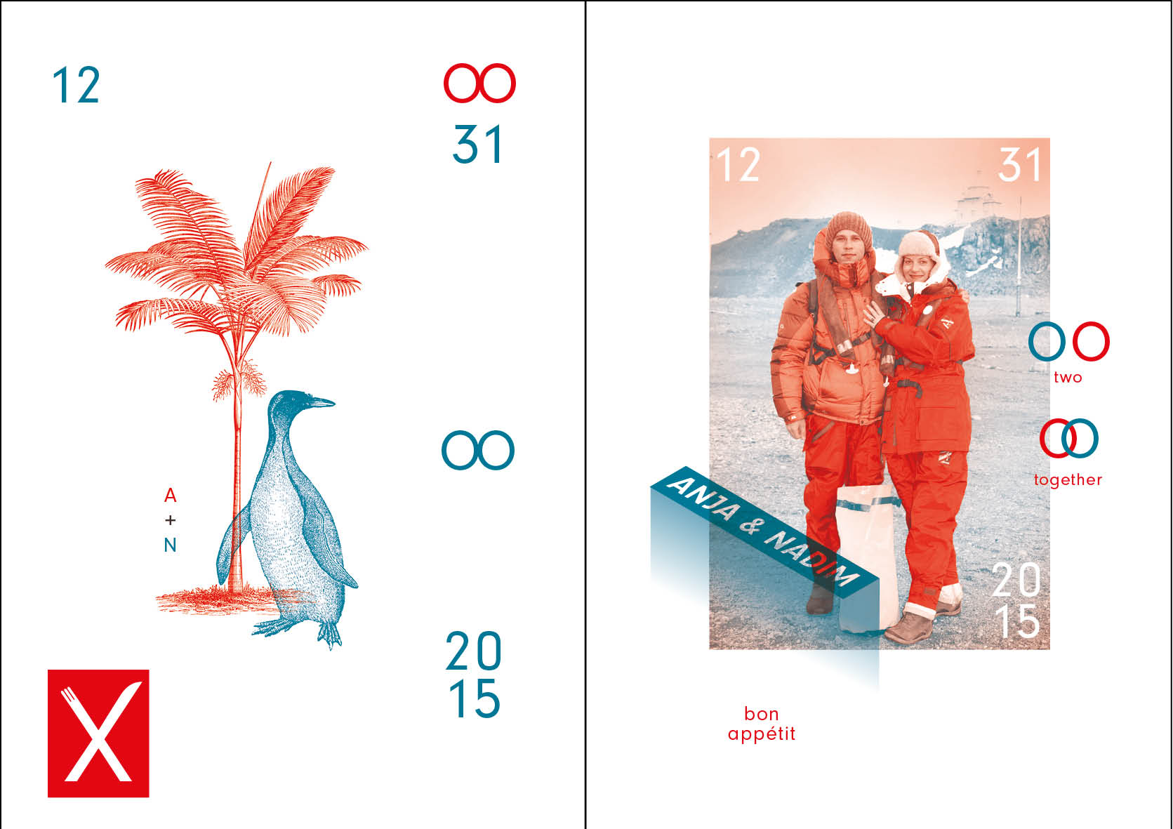 The menue card for the wedding has a straight two colour layout for the unique printing process with a Risograph machine. The illustrations play with the background of the story of bide and groom.